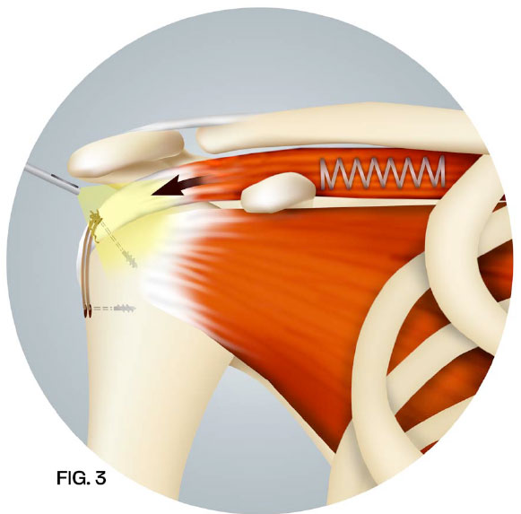 Sutures arising from the anchors are weaved through the rotator cuff tendon and special knots are tied that cinch the tendon back to its insertion. Bone spurs within the shoulder are removed with a small bur (Figure 3).